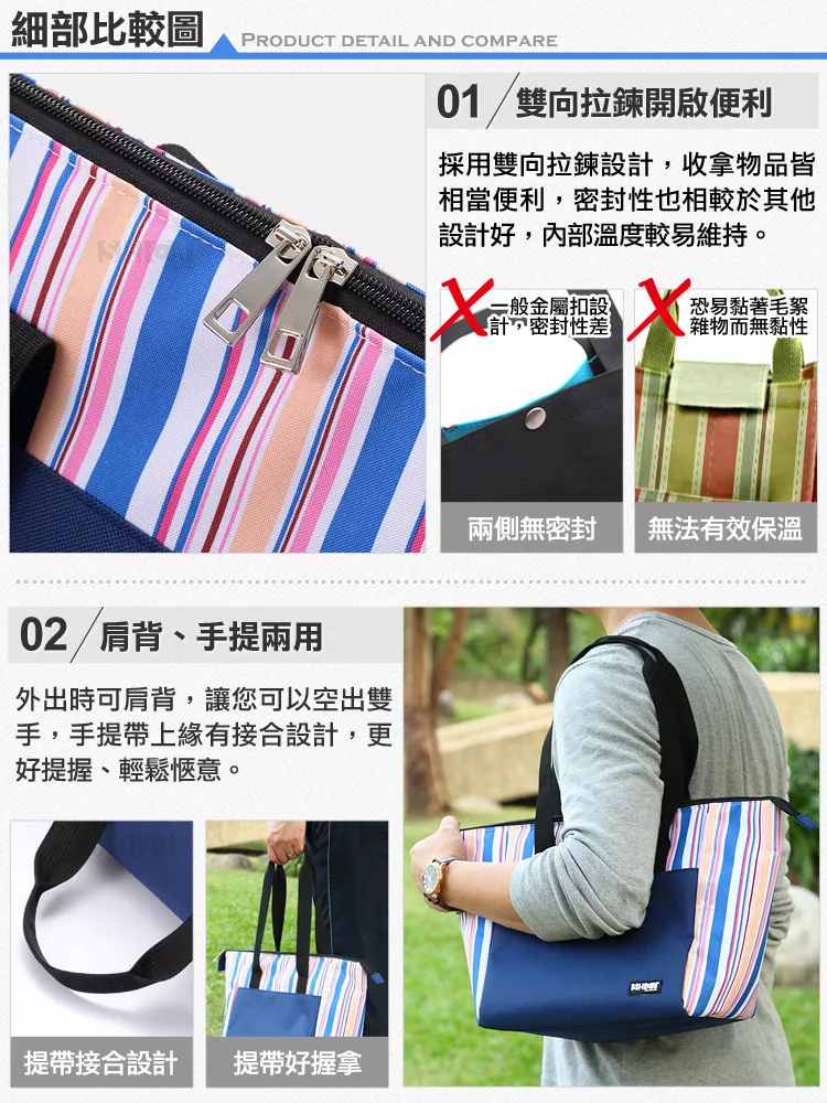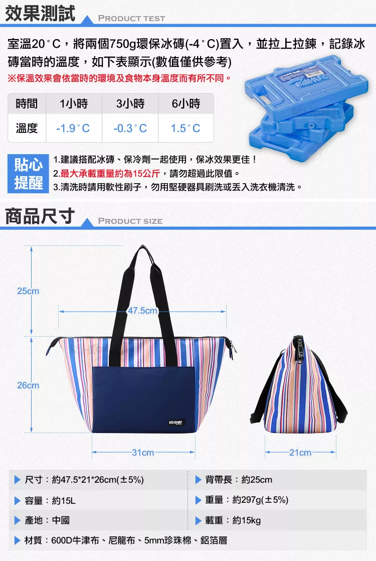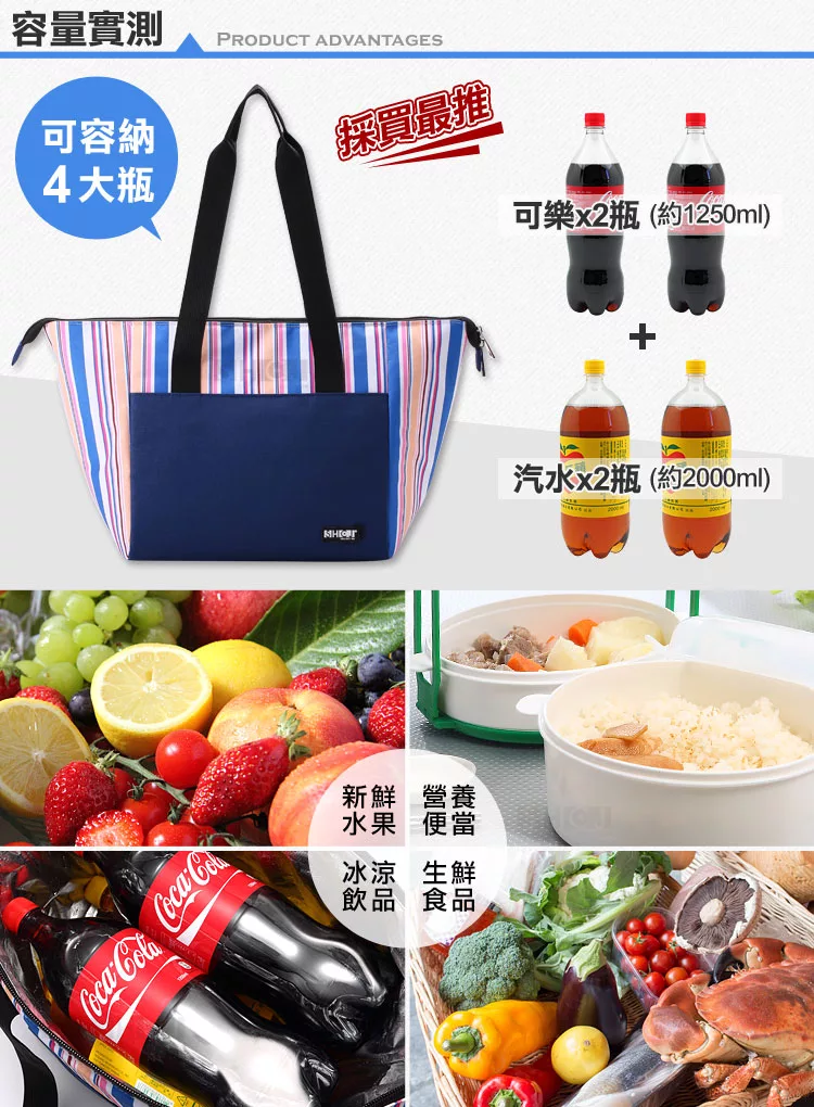 戶外出遊野餐還再用醜醜又不環保的塑膠袋嗎?來看看這款專為外出活動設計的【生活采家保溫袋系列】,它活潑的彩條色彩,美化了保溫袋既有的風格,貼心的15公升容量,還有高密度EPE珍珠棉保溫內層,在出遊或購物的過程中能保鮮您的物品,讓您帶出門時更加時尚、有型、無負擔!!容量:15公升,大寬口、大容量,使用更便利。